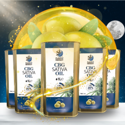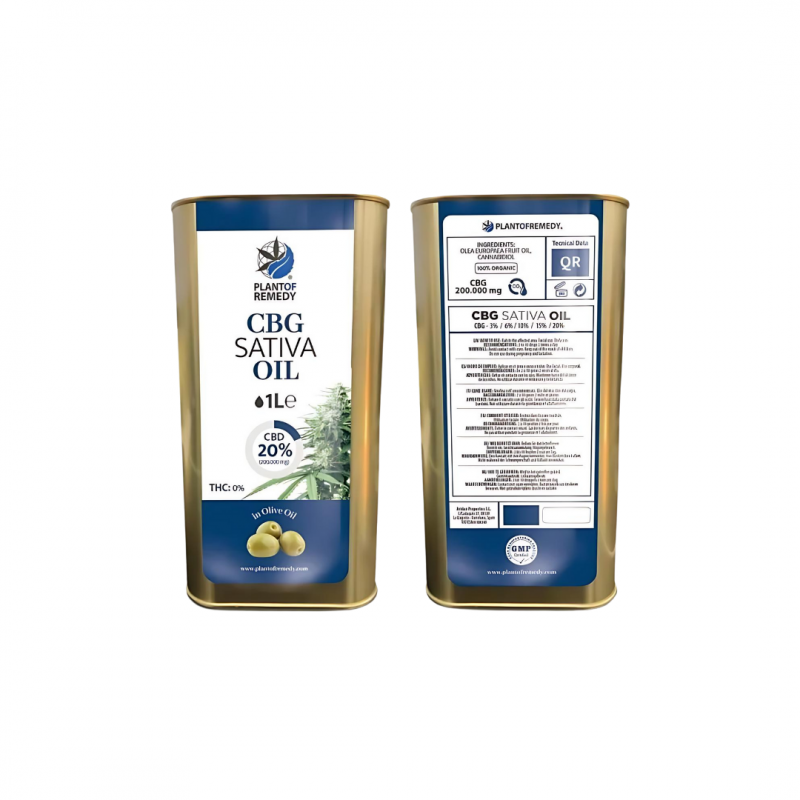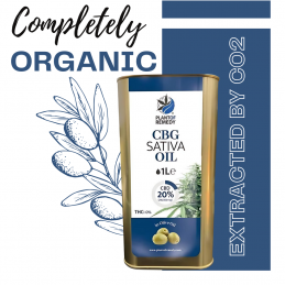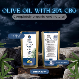 Ecological olive oil with 20% CBG 1 liter format By plant of remedy Completely organic and natural. Packaging in opaque metal bottles to provide protection against blows, oxidation and light sources. 1 liter bottle - (200,000mg CBG)
