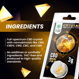 Le CRYSTAL CBD Full Spectrum contient une forte concentration de CBD avec tout le spectre des cannabinoïdes présents dans la plante de chanvre, y compris CBG, CBN et CBC. Ce produit est idéal pour ceux qui recherchent les avantages complets du CBD, ainsi que la synergie d'autres cannabinoïdes, connue sous le nom d'« effet d'entourage ».