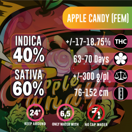 PLANT OF LIFE - APPLE CANDY ✨ FEMMINIZZATA 🌿 Tipo: Sativa 60% / Indica 40% 🌺 Periodo di fioritura: 63-70 giorni 🌱 Produzione approssimativa: 300 g 🌳 Altezza: 76-152 cm ⚡ THC: 17-18'75%